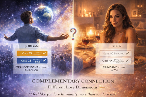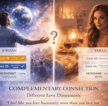 "Complementary connections require translation. The Transcendent partner needs to ground into daily intimacy. The Mundane partner needs to allow space for transcendent connection. This pairing works beautifully when both honor the difference."